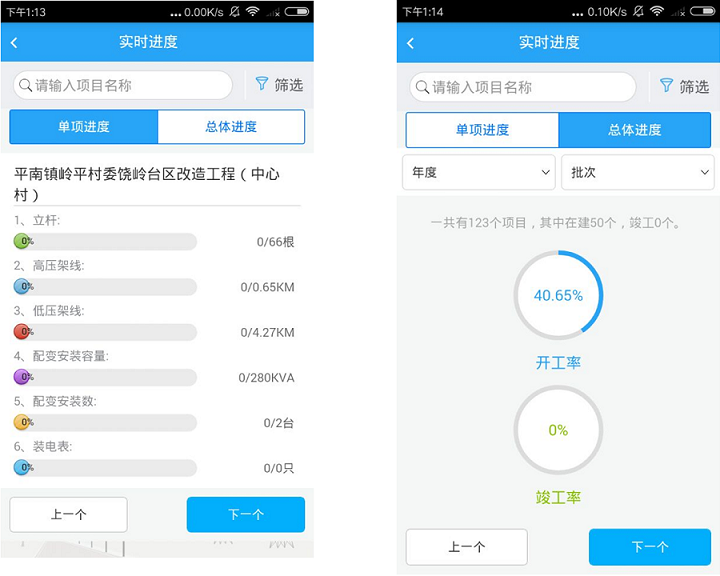所有項目施工進度自動匯總,生成進度報告。以圖表形式展示開工率、竣工率、完工量。