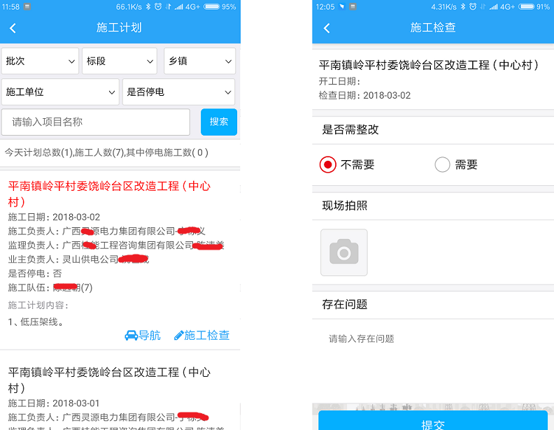 施工人員通過APP報送日施工計劃、完工量,管理人員根據(jù)計劃檢查施工情況,發(fā)現(xiàn)問題立即反饋給施工各方整改??涩F(xiàn)場拍照記錄檢查情況。極大地方便監(jiān)理、業(yè)主跟進施工進度,監(jiān)督施工質(zhì)量。